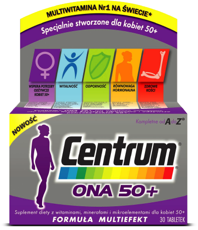 Centrum Ona 50+ zostało specjalnie opracowane w celu wspierania korzyści zdrowotnych i zaspokojenia odżywczych potrzeb kobiet po 50-tym roku życia.
