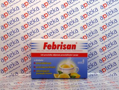 Febrisan jest preparatem o skojarzonym działaniu trzech składników: paracetamolu, fenylefryny i witaminy C. Działa przeciwgorączkowo, przeciwbólowo, udrażnia przewody nosowe oraz uzupełnia niedobory witaminy C.