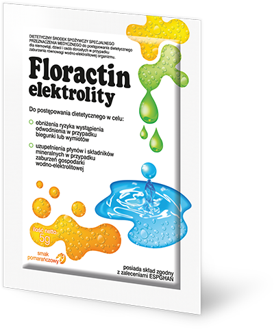 Floractin Elektrolity to dietetyczny środek  spożywczy specjalnego przeznaczenia medycznego, o zmniejszonej osmolarności. Preparat uzupełnia płyny i składniki mineralne w przypadku zaburzeń równowagi wodno-elektrolitowej, które mogą wystąpić w organizmie, zwłaszcza podczas biegunki lub wymiotów. Przeznaczony dla niemowląt, dzieci i dorosłych.