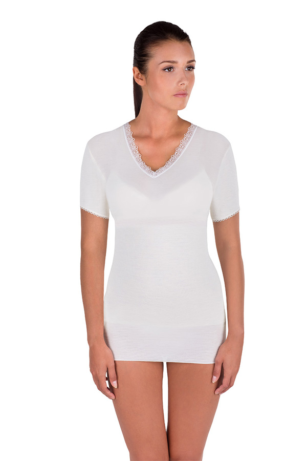 Koszulki damskie wykończone są delikatnymi elastycznymi koronkami. Dekolt w kształcie litery „V”