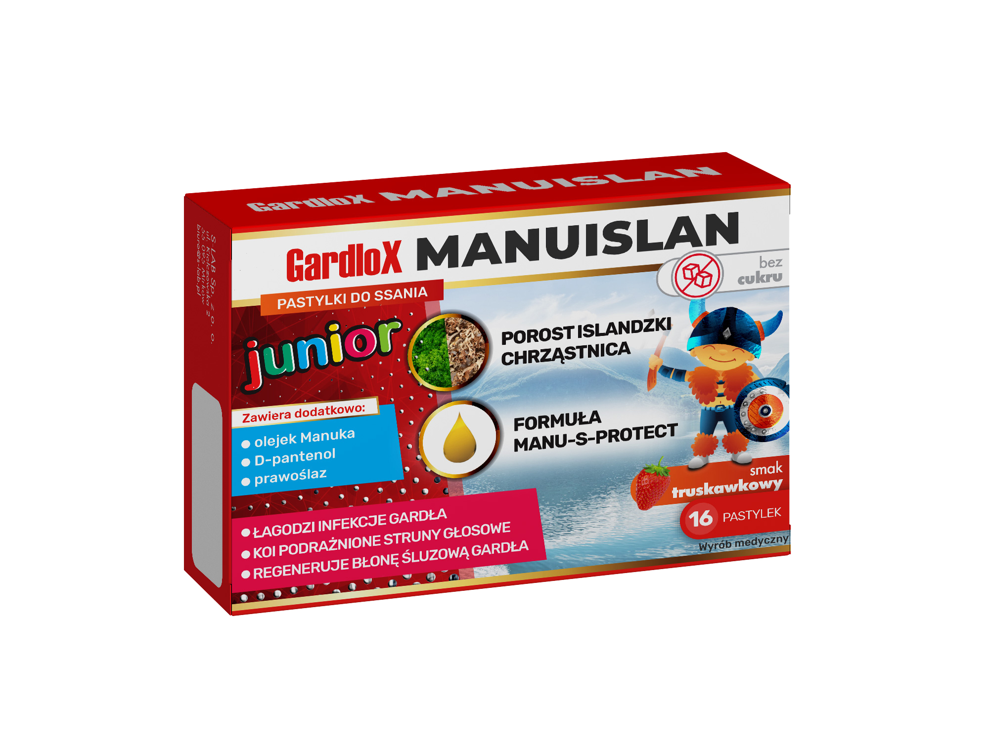 Innowacyjny wyrób nawilżająco-regenerujący gardło. Zawierający połączenie aż 3 składników nawilżających w maksymalnych dopuszczonych do stosowania na błony śluzowe gardła dawkach: porost islandzki, chrząstnica kędzierzawa i prawoślaz, regenerującego D-pantenolu oraz formuły Manu-S-Protect zawierającej dobroczynny olejek Manuka.