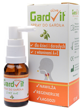 GardVit Olive to spray nawilżający do gardła z kompozycją naturalnych składników: wzmacniających układ odpornościowy witamin A+E oraz natłuszczającej oliwy z oliwek. Dzięki lepkości oliwy z oliwek skutecznie koi podrażnienia i przywraca głos.
