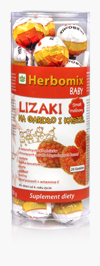 Herbomix® Baby - lizaki na gardło i kaszel zawiera kompleksowy zestaw starannie dobranych składników naturalnego pochodzenia takich jak: wyciągi z ziół, mód pszczeli, maliny, ponadto wzbogacony jest witaminą C. Dzięki właściwej recepturze uzupełnia dietę, zapewniając pełną ochronę śluzówek jamy ustnej, gardła i dróg oddechowych. Wspiera także naturalne mechanizmy odpornościowe i uzupełnia dietę w składniki, które wspomagają prawidłowe funkcjonowanie śluzówek jamy ustnej i gardła.