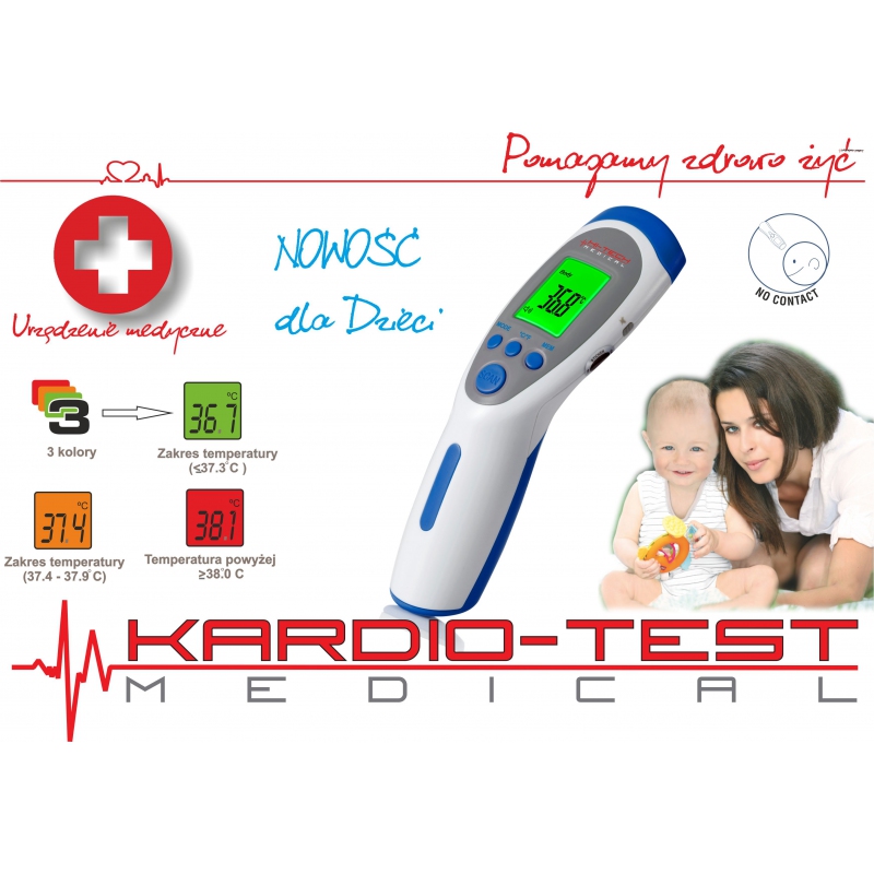 Termometr HI-TECH MEDICAL KARDIO-TEST KT-70 PRO na podczerwień zaprojektowano do pomiaru temperatury ciała lub wybranej powierzchni przy użyciu technologii promieniowania podczerwonego. Termometr na podczerwień nie jest inwazyjny, więc jest łatwiejszy i wygodniejszy w użyciu niż tradycyjne termometry doustne, pod ramię, do odbytnicze lub douszne. Jest rzeczywiście „bezkontaktowym” termometrem. Umożliwia pomiar temperatury ciała dorosłych i dzieci bez konieczności dotykania skóry. Dzięki KT-30 nie ma potrzeby wprowadzania sondy termometru do jakiejkolwiek części ciała twojego niemowlęcia. Śpiące niemowlę nie obudzi sie podczas kiedy termometr będzie w użyciu ani nie odczuje żadnego dyskomfortu podczas jego użycia kiedy nie śpi.