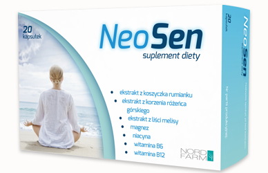Suplement diety NeoSen to kompozycja ekstraktów z liści melisy, korzenia różeńca górskiego, koszyczka rumianku, magnezu oraz witamin (niacyna, witamina B6, witamina B12).