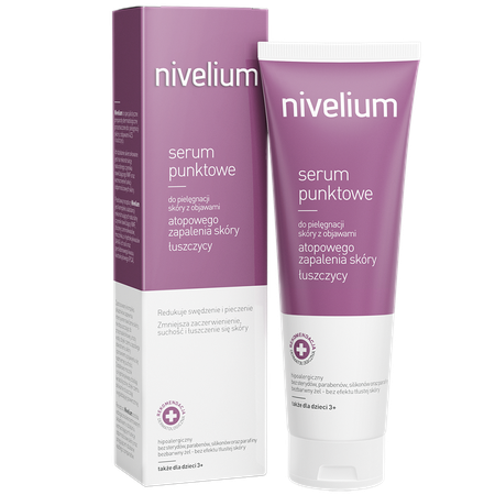 Nivelium serum punktowe w postaci bezbarwnego żelu przeznaczone do pielęgnacji skóry z objawami atopowego zapalenia skóry i łuszczycy. Serum intensywnie nawilża i zabezpiecza skórę przed odwodnieniem. Tym samym skutecznie zmniejsza szorstkość i łuszczenie się naskórka, a także wyraźnie redukuje uczucie swędzenia, pieczenia oraz nadmiernej suchości czy szorstkości skóry. Dodatkowo koi i łagodzi zaczerwienienia.