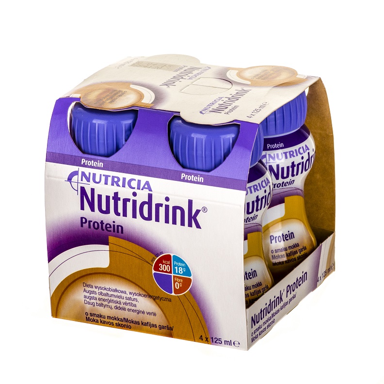 Nutridrink Protein 125 ml to wysokoenergetyczny i wysokobiałkowy preparat odżywczy w płynnej postaci, przeznaczony do picia. Zawiera dużą ilość białka oraz wszystkie pozostałe składniki odżywcze w odpowiednich proporcjach: tłuszcze, węglowodany oraz komplet witamin i minerałów. Jego zaletą jest to, że w bardzo małej objętości (125 ml) dostarcza dużo energii i wszystkie niezbędne osobie chorej składniki odżywcze. Dzięki formie płynnej i małej objętości jest łatwy do podania. Może być uzupełnieniem standardowej diety osoby chorej, do spożywania między posiłkami lub może zastąpić posiłek.