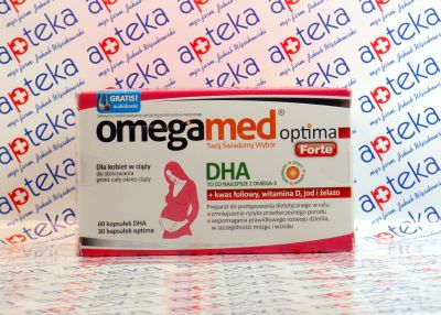 Zawiera 5 zalecanych, niezbędnych składników, które zgodnie z Zaleceniami Ekspertów powinna dodatkowo przyjmować kobieta w ciąży w Polsce: DHA, kwas foliowy, witaminę D, jod i żelazo. Omegamed® Optima Forte jest wzbogacony o dodatkowe ilości DHA i witaminy D.