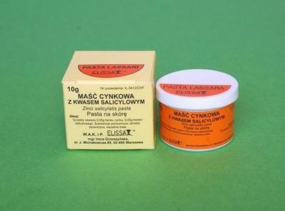 Skład: 1g pasty zawiera 0,25g tlenku cynku, 0,02g kwasu salicylowego;
