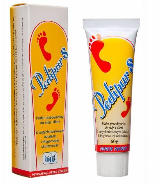 Nadmierna potliwość połączona z nieprzyjemnym zapachem jest niewątpliwie poważnym problemem estetycznym i psychospołecznym, dotyczącym aż 1% dorosłej populacji. Nadmierna potliwość najczęściej dotyczy skóry stóp i dłoni. Sprzyja rozwojowi różnych gatunków grzybów, stanowiących przyczynę poważnego uszkodzenia skóry. Nasilenie pocenia stóp i dłoni zależy od czynników takich jak: temperatura, układ nerwowy wegetatywny, wysiłek mięśniowy, jak również ilość przyjętego przez organizm płynu. Puder do stóp i dłoni Pedipur S skutecznie zwalcza nadmierną potliwość stóp i dłoni, zmniejsza wydzielanie potu oraz likwiduje jego przykry zapach na stopach, butach i skarpetkach. Działa również przeciwgrzybiczo, wysuszająco i ściągająco oraz łagodzi objawy podrażnienia. Ponadto zmiękcza i odświeża skórę, przynosząc ulgę zmęczonym stopom. Za działanie przeciwpotne odpowiada metenamin. Działanie swoje zawdzięcza uwolnieniu, wskutek kontaktu z kwaśnym potem, aldehydowi mrówkowemu, który osłabia czynność gruczołów potowych oraz działa przeciwbakteryjnie. Zawarta w preparacie siarka wzmaga działanie metenaminy. Wykazuje także działanie wysuszające i adsorbujące. Siarka działa również keratolitycznie i powoduje złuszczenie zrogowaciałej warstwy naskórka