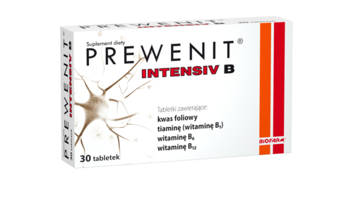 Suplement diety Prewenit® Intensiv B zawiera w swoim składzie kwas foliowy, tiaminę (witaminę B1) oraz witaminy: B6 i B12 dla uzupełnienia codziennej diety.