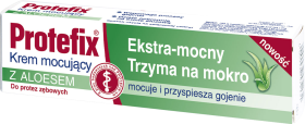 Protefix krem mocujący Z ALOESEM silnie mocuje protezę, a jednocześnie redukuje stany zapalne, które są problemem wielu pacjentów protetycznych. Aloes jest zaliczany do najsilniejszych immunomodulatorów roślinnych. Wyciąg z Aloesu vera zawiera bioaktywne substancje, które wykazują silne działanie przeciwzapalne, przeciwgrzybicze i przeciwbakteryjne oraz redukujące ból. Skuteczność aloesu opiera się na szczególnym powinowactwie do ludzkiego nabłonka: posiada pH zbliżone do pH błony śluzowej (pH 5,4) i jest doskonale wchłaniany przez komórki nabłonka. Doskonale przyspiesza gojenie zranień, zmniejsza ból, hamuje namnażanie bakterii i grzybów chorobotwórczych.