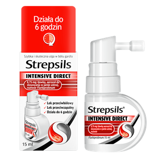 - Strepsils Intensive Direct z maksymalną dawką flurbiprofenu to najsilniejszy spray na ból gardła*.