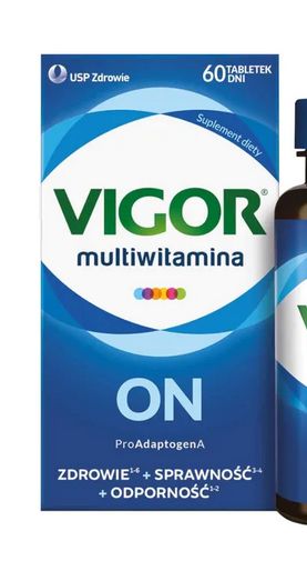 Vigor Multiwitamina On to suplement diety przeznaczony dla mężczyzn zawierający witaminy i minerały, wzbogacony o formuję ProAdaptogenA z ekstraktem z ashwagandhy. Składniki zawarte w produkcie wykazują działanie wspierające witalność i odporność na stres, sprawność seksualną i poziom testosteronu, siłę fizyczną i mięśnie, a także prawidłowy metabolizm oraz serce i układ krążenia.