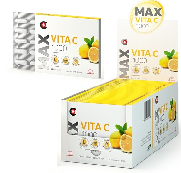MAX VITA C1000 to preparat zawierający 1000 mg witaminy C (kwasu L-askorbinowego) w jednej kapsułce, która charakteryzuje się wysoką przyswajalnością oraz optymalną absorpcją.