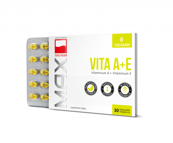 MAX VITA A+E to wysokiej jakości suplement diety w postaci kapsułek miękkich zawierający rozpuszczalne w tłuszczach witaminy A i E. Witamina A uczestniczy w procesie specjalizacji komórek, pomaga zachować zdrową skórę oraz prawidłowy stan błon śluzowych. Wspiera funkcje układu odpornościowego i prawidłowe widzenie, a także przyczynia się do utrzymania prawidłowego metabolizmu żelaza. Witamina E pomaga w ochronie składników komórek przed stresem oksydacyjnym.