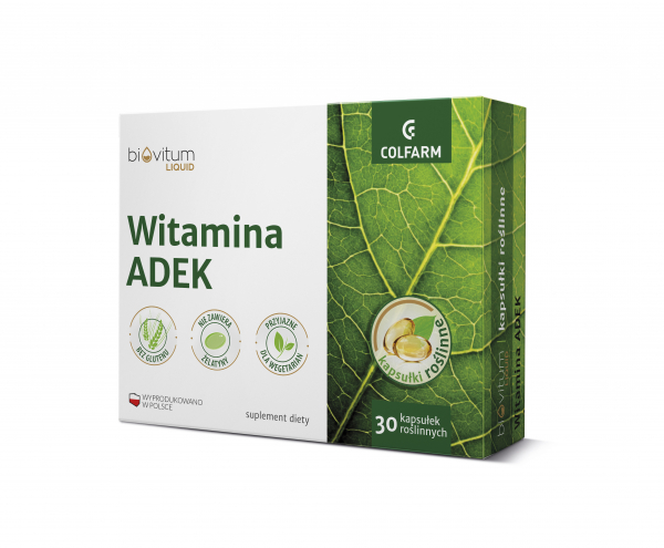 Naturalne kapsułki roślinne Biovitum Liquid Witamina ADEK to zestaw witamin rozpuszczalnych w tłuszczach. Witamina A korzystnie wpływa na utrzymanie zdrowia skóry oraz prawidłowego wzroku. Witamina E wspomaga ochronę DNA, białek i lipidów. Witamina D wspomaga utrzymanie prawidłowego stanu zębów i kości, wchłanianie i wykorzystywanie wapnia i fosforu. Wspiera podziały komórek i funkcjonowanie układu odpornościowego. Witamina K wspomaga utrzymanie prawidłowego stanu kości, wpływa także na prawidłowe krzepnięcie krwi.