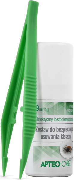 Zestaw do bezpiecznego usuwania kleszczy APTEO CARE jest wyrobem medycznym przeznaczonym do usuwania kleszczy z ciała człowieka przez ich całkowite zamrożenie. Stosowanie zestawu może przyczynić się do ograniczenia ryzyka przenoszenia chorób odkleszczowych występujących u ludzi, m.in. boreliozy, kleszczowego zapalenia mózgu, babeszjozy, wywoływanych przez ukąszenie pasożyta.